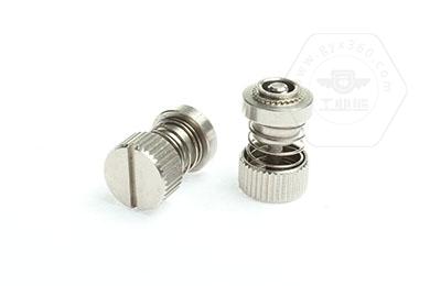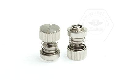 手緊螺釘?shù)膲恒T套具有壓花齒,壓裝于于機箱或薄鈑孔內(nèi)(注:薄板的鉆孔徑相對應(yīng)彈簧螺釘?shù)膲糊X徑有一定要求的,形成一個外露的彈簧螺釘,用手?jǐn)Q另一端(即手?jǐn)Q端).因其里面固定有彈簧,螺釘相對于薄板的另一端來回進出。