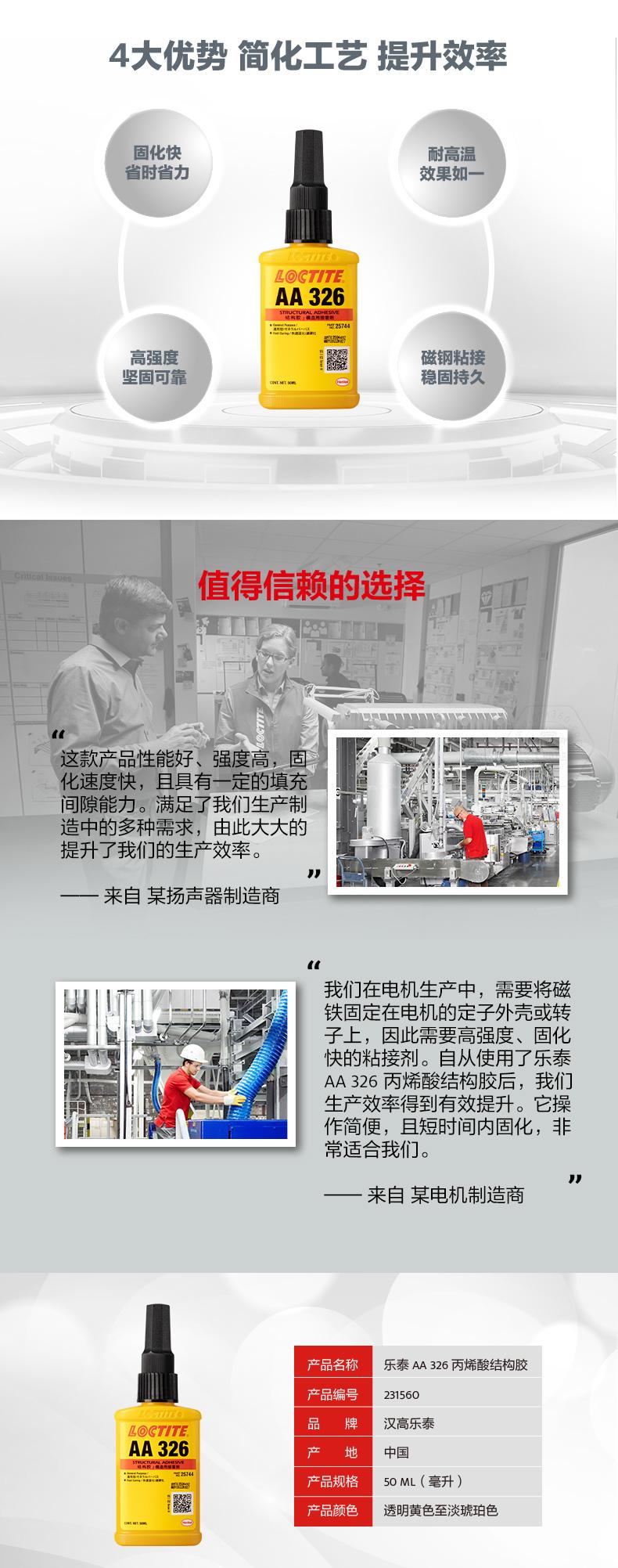 樂泰AA326丙烯酸結構膠粘稠度適中(觸變),無需混合,適用于磁鋼及金屬部件粘接。樂泰AA326丙烯酸結構膠僅需3分鐘即可快速固化,節(jié)省工時。樂泰AA326丙烯酸結構膠在120℃高溫工況下效果如一,且具備高強度特點。樂泰AA326丙烯酸結構膠主要用于將鐵氧體粘接到要求快速固定的電機定子或轉(zhuǎn)子上,也可用于揚聲器零件和珠寶。