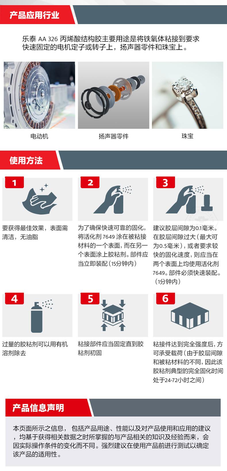 • 產(chǎn)品描述:樂泰AA 326是一款無需混合、中粘度的觸變型結構粘合劑,呈黃色至琥珀色,適合磁鋼粘接,電機、揚聲器硬件和珠寶中的鐵氧體/電鍍材料。針對不同類型的鐵氧體具有良好的粘接力,固化僅需3分鐘,剪切強度為2200 psi,最高耐受溫度為120°C。需搭配樂泰SF 7649 促進劑使用。